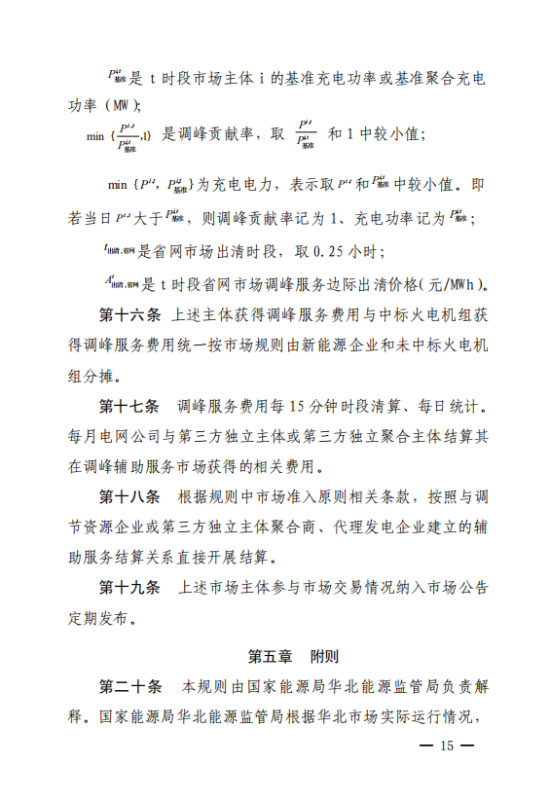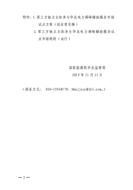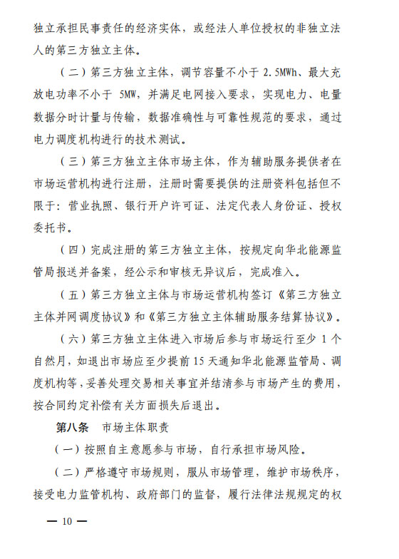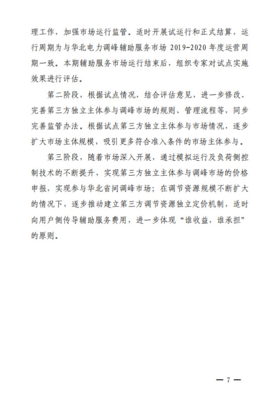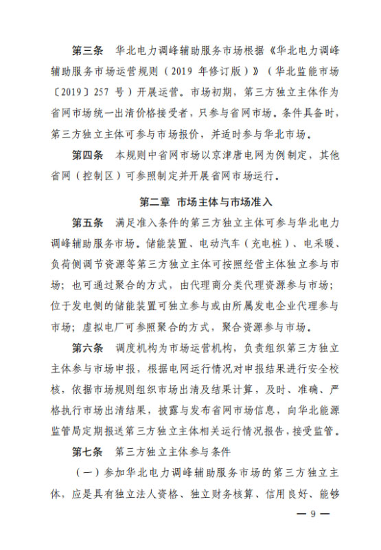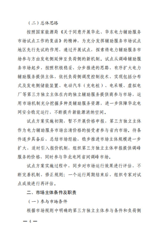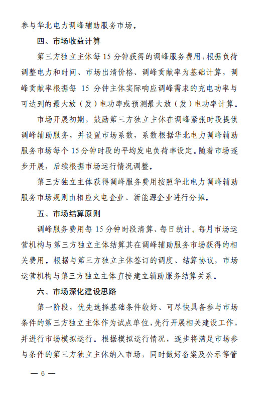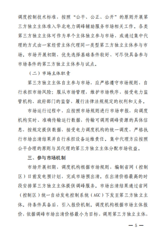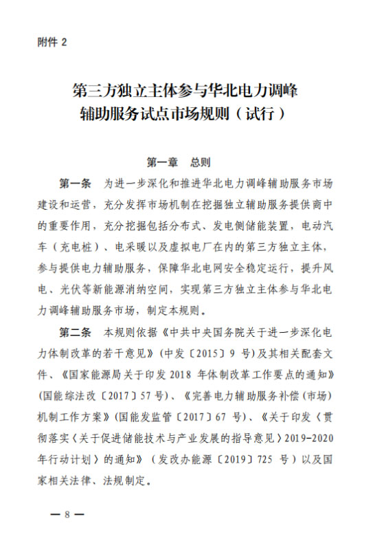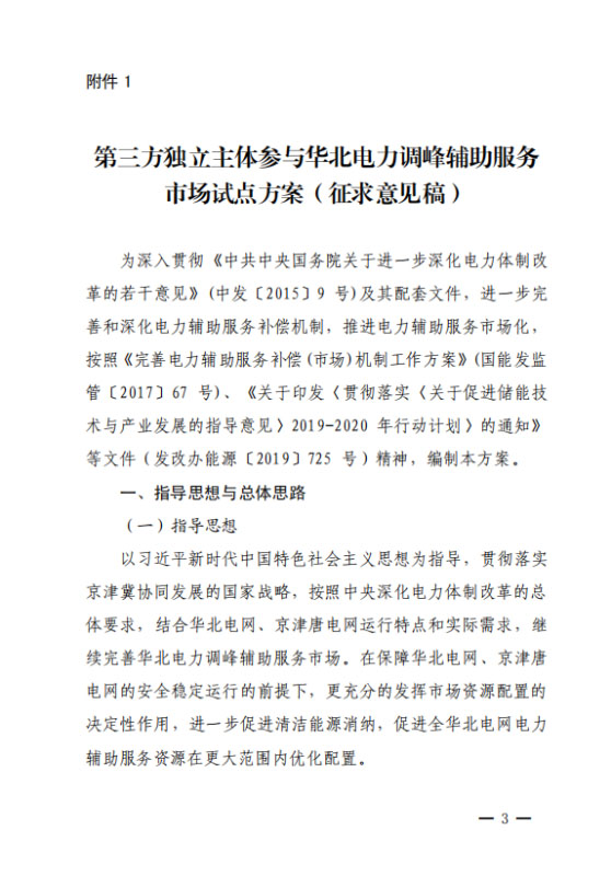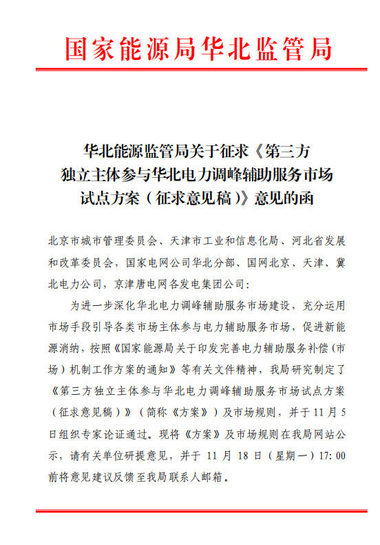 中國儲能網(wǎng)訊:據(jù)悉,為進一步深化華北電力調(diào)峰輔助服務市場建設,充分運用市場手段引導各類市場主體參與電力輔助服務市場,促進新能源消納,按照《國家能源局關(guān)于印發(fā)完善電力輔助服務補償(市場)機制工作方案的通知》等有關(guān)文件精神,國家能源局華北監(jiān)管局研究制定了《第三方獨立主體參與華北電力調(diào)峰輔助服務市場試點方案(征求意見稿)》(簡稱《方案》)及市場規(guī)則,以下為文件全文。