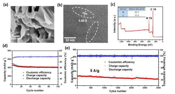 高氮摻雜微晶碳的結(jié)構(gòu)及儲鉀性能:(a)SEM形貌表征(b)TEM顯微結(jié)構(gòu)(c)XPS成分分析(d)低電流密度下的電池容量(e)5 A/g大電流下的長循環(huán)性能