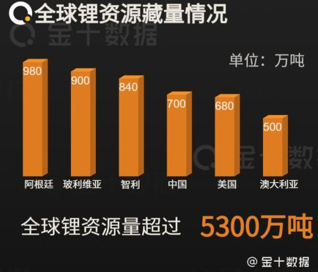 隨著各國開足馬力加速布局全球鋰市場,中國又是如何應(yīng)對呢?雖然此前中國工業(yè)用鋰有80%需要依賴進口,但是從資源藏量上來看,中國的鋰礦資源并不少。根據(jù)美國地質(zhì)調(diào)查局2018年最新報告顯示,全球鋰資源量超過5300萬噸,其中阿根廷占有980萬噸、玻利維亞占有900萬噸、智利占有840萬噸、中國占有700萬噸、美國占有680萬噸、澳大利亞占有500萬噸。
