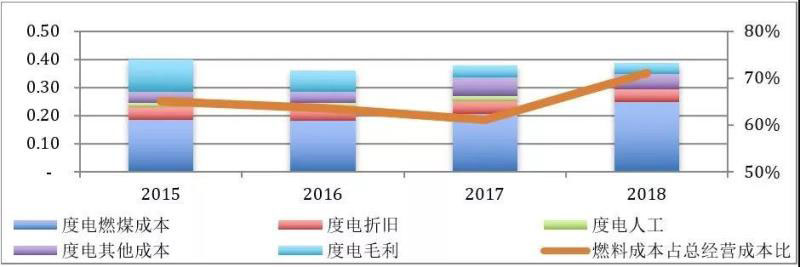 圖2 華能國(guó)際歷年成本及毛利構(gòu)成(元/kwh,不含稅)、燃料成本占比(右軸)