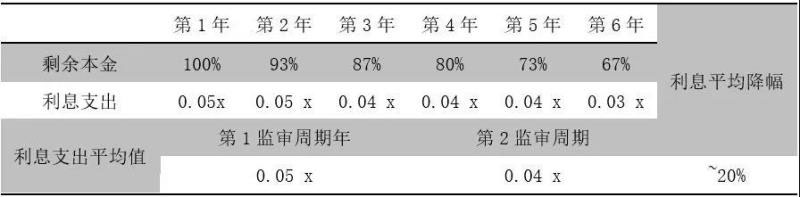 利息支出是輸配電項(xiàng)目的第二大支出項(xiàng)目。假設(shè)第一成本監(jiān)審周期起點(diǎn)時(shí)剩余還款年限為15年,等額本金方式還款,由于持續(xù)償還本金,報(bào)表收縮,相同貸款利率情況下,第二監(jiān)管周期內(nèi)利息支出降幅可達(dá)20%,由于利息支出在總成本中的占比逐年下降,以20%的成本占比來(lái)初步匡算,在總成本下降上可貢獻(xiàn)約4%的幅度。