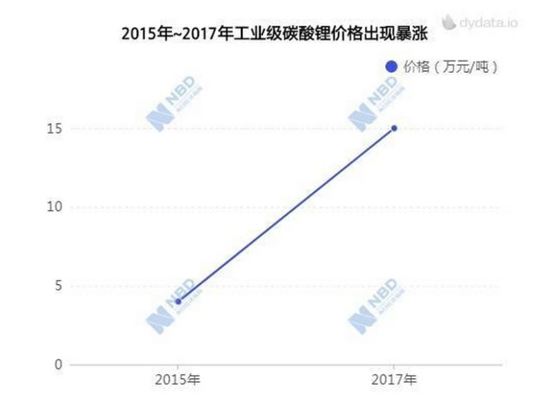 鋰價(jià)上漲成為必然。自2015年至2017年,工業(yè)級碳酸鋰價(jià)格從4萬元/噸左右,一度飆升至15萬元/噸。