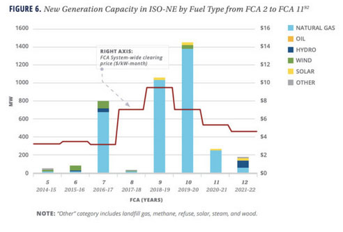 新英格蘭地區(qū)的能源部署情況也很類似。以下這張圖表顯示了ISO-NE公司近年來和計(jì)劃增加的天然氣產(chǎn)能(淺藍(lán)色):