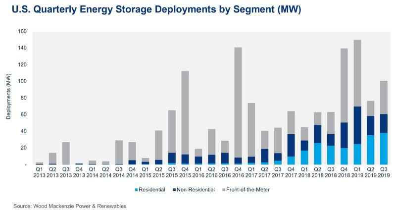 住宅電池儲(chǔ)能系統(tǒng)的這種增長(zhǎng)早在太平洋天然氣和電力公司為了防火而采取停電措施之前就已經(jīng)發(fā)生。而在加利福尼亞州分別在10月和11月發(fā)生的斷電事件使數(shù)百萬人斷電數(shù)小時(shí)或數(shù)天的時(shí)間。其停電事件是最近才發(fā)生的,并不是美國儲(chǔ)能市場(chǎng)第三季度增長(zhǎng)的主要原因。