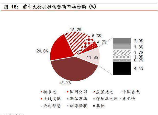 洗牌過后,頭部效應(yīng)愈發(fā)明顯。廣證恒生充電樁行業(yè)報告顯示,2018年國內(nèi)充電樁市場中,特來電占據(jù)42%,其次是國網(wǎng)的20%、星星充電占據(jù)18%,可以看到,僅頭部的5家企業(yè)就瓜分了90%的蛋糕。