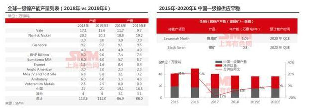 2019年國內(nèi)部分硫酸鎳企業(yè)轉(zhuǎn)產(chǎn)一級鎳,國內(nèi)產(chǎn)量同比去年增加。但因硫化礦資源稀缺,一級鎳產(chǎn)量增幅有限,預(yù)計2020年產(chǎn)量平穩(wěn)。全球來看,高鎳價刺激停產(chǎn)產(chǎn)能復(fù)產(chǎn),SavannahNorth項目和BlackSwan項目已計劃于2020年復(fù)產(chǎn),或帶來一級鎳產(chǎn)量的增加,但同時BHP計劃于2020年二季度投產(chǎn)硫酸鎳并減少一級鎳的產(chǎn)量。SMM預(yù)計2020年全球一級鎳產(chǎn)量同樣平穩(wěn)。硫化礦重啟成本高且時間周期長,未來2年內(nèi)一級鎳產(chǎn)量平穩(wěn)。