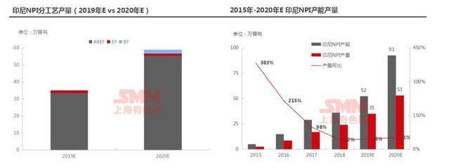 2019年中國NPI產(chǎn)量增長至58萬鎳噸,高利潤及環(huán)保影響的消退,疊加新增產(chǎn)能釋放的增量,同比增速達28%。2020年,印尼禁礦生效之后,中國NPI陷入原料短缺的困境,以全年所能供應(yīng)的紅土鎳礦數(shù)量預(yù)計,中國NPI產(chǎn)量大幅下滑至51萬鎳噸。印尼禁止鎳礦出口后中國NPI產(chǎn)量轉(zhuǎn)為負增長。