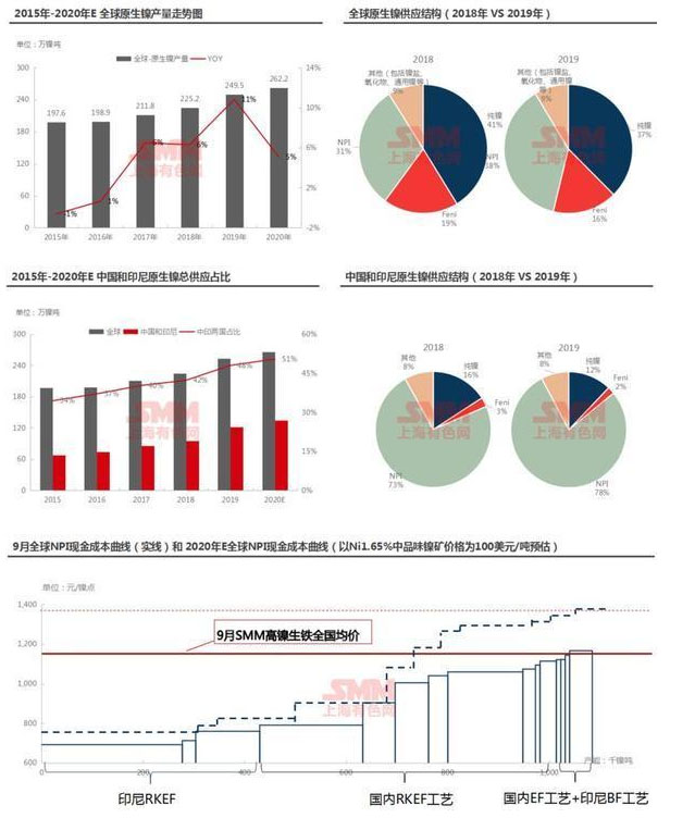 從全球原生鎳的供應(yīng)格局來看,2019年全球原生鎳產(chǎn)量為249萬鎳噸,同比增11%,增量來自中國和印尼的NPI。預(yù)計2020年全球原生鎳產(chǎn)量增長至262萬鎳噸,受中國NPI大幅減產(chǎn)影響,產(chǎn)量增速下滑。全球原生鎳供應(yīng)結(jié)構(gòu)中,二級鎳在NPI的帶動下占比繼續(xù)上升,一級鎳占比下降。中國和印尼兩國原生鎳供應(yīng)將占全球供應(yīng)的50%,主要為NPI。預(yù)計2020年鎳礦漲價將導(dǎo)致國內(nèi)NPI生產(chǎn)成本超過1300元/鎳點。