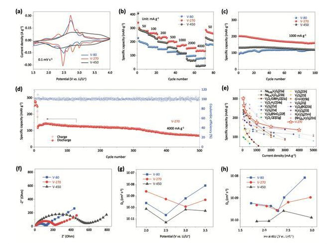 下圖為在不同溫度下合成的釩酸鋰材料的電化學(xué)性能測試曲線,從下圖a的循環(huán)伏安曲線可以看到該V-80和V-270材料具有相似的氧化還原峰,但是V-450材料則沒有出現(xiàn)顯著的氧化還原峰。