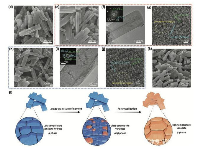 根據(jù)釩酸鹽材料前驅(qū)體材料在熱處理過程中的這一特性,可以通過控制加熱溫度的方式對材料的結(jié)構(gòu)進(jìn)行調(diào)控,作者分別采用三種溫度對其進(jìn)行了處理:1)V-80是在80℃下進(jìn)行2h地處理;2)V-270時在270℃下處理2h;3)V-450是在450℃下進(jìn)行2h處理。