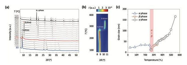 在材料的晶體結(jié)構(gòu)隨著溫度發(fā)生變化的同時,我們可以看到特征峰的寬度也在變寬,這可能是由于晶體顆粒直徑變化引起的,或者是由于晶體結(jié)構(gòu)內(nèi)部的缺陷導(dǎo)致的,作者通過Scherrer公式進(jìn)行計算表明晶體顆粒的尺寸是引起衍射峰變寬的主要因素。從下圖c的計算結(jié)果可以看到在270℃左右發(fā)生相轉(zhuǎn)變時材料的晶粒尺寸會出現(xiàn)明顯的降低,當(dāng)從常溫升高到250℃時,材料的晶粒尺寸從約20nm升高到了35nm,但是溫度達(dá)到260-270℃,材料從α相轉(zhuǎn)變?yōu)棣孪嗟倪^程中,α相晶粒的尺寸降低到了13nm,在270℃時β相的晶粒尺寸最低降低到了11nm,但是隨后隨著溫度的升高,則會導(dǎo)致材料的晶粒尺寸繼續(xù)升高。