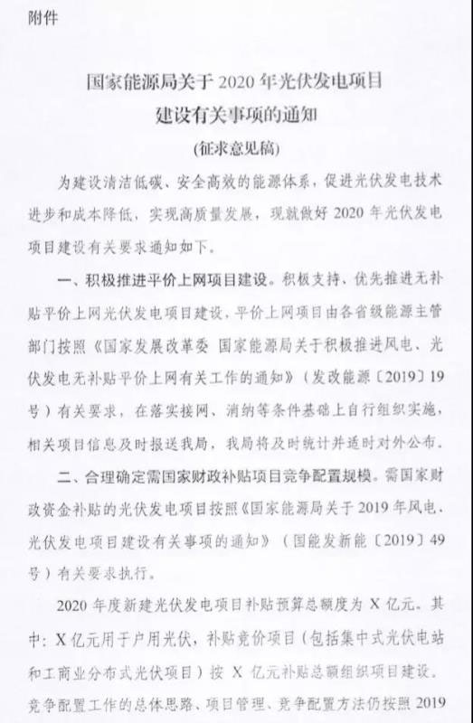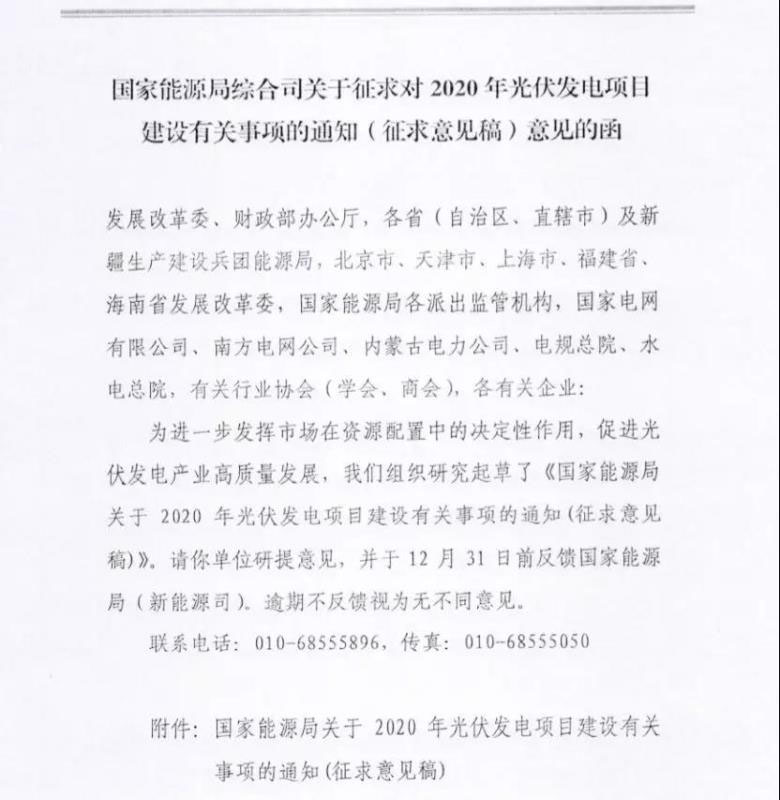 近日,光伏們獲悉,各省能源主管部門已經(jīng)收到國家能源局下發(fā)的《關(guān)于征求對2020年光伏發(fā)電項目建設(shè)有關(guān)事項的通知(征求意見稿)意見的函》。