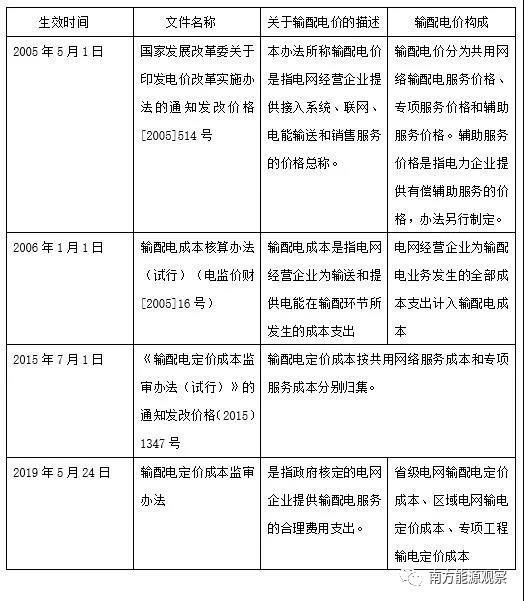 電化學(xué)儲能在電力系統(tǒng)內(nèi)可以承擔(dān)多種應(yīng)用,對于電網(wǎng)側(cè)儲能,有的應(yīng)用屬于輔助服務(wù)的范疇,如調(diào)峰調(diào)頻、冷熱備用、黑啟動等;有的屬于輸配電服務(wù)范疇,如延緩線路擴(kuò)容、緩解線路阻塞、調(diào)壓和輸電線路熱管理等。而電力資產(chǎn)通過電價(jià)疏導(dǎo)的方式主要有兩種,一是“準(zhǔn)許成本+合理收益”的方式;另外一種方式是通過市場的方式,價(jià)格高低由供需關(guān)系決定。若電化學(xué)儲能只從事輸配電服務(wù)相關(guān)的業(yè)務(wù),其成本應(yīng)該被計(jì)入輸配電價(jià);而從事輔助服務(wù)這部分成本對應(yīng)的電價(jià)則是輔助服務(wù)電價(jià)。只是到目前為止,輔助服務(wù)機(jī)制(市場)還是各種發(fā)電機(jī)組之間的“零和游戲”,現(xiàn)行輸配電價(jià)中不包含輔助服務(wù)電價(jià)。按照國家能源局發(fā)布的輔助服務(wù)市場推進(jìn)的時(shí)間表來看,這部分成本最終將疏導(dǎo)到終端電價(jià)。筆者查閱了2002年以來關(guān)于輸配電價(jià)構(gòu)成的相關(guān)政策,如下表所示: