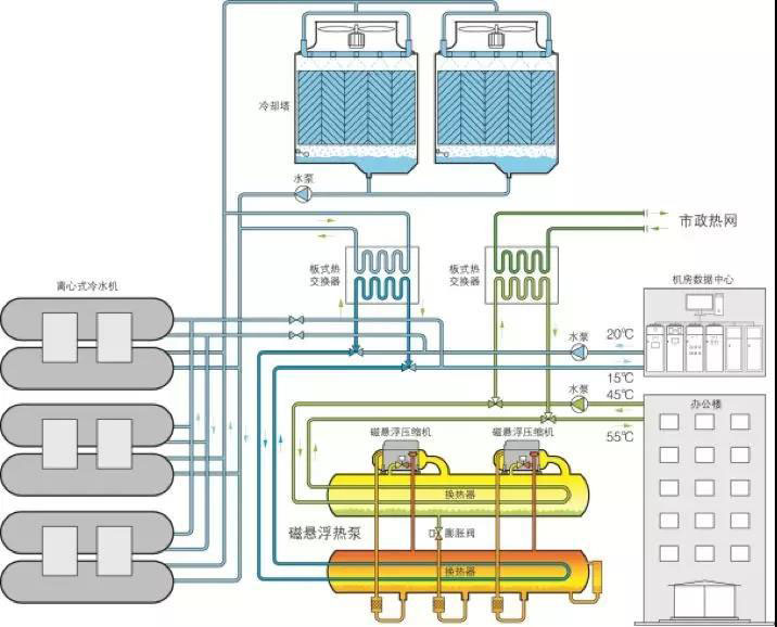 縱觀國(guó)內(nèi)數(shù)據(jù)中心對(duì)于冷源系統(tǒng)的研究主要集中在制冷機(jī)組性能能效提高,冷熱源技術(shù)方案優(yōu)化、自然冷卻和可再生能源利用等方面。對(duì)于數(shù)據(jù)中心余熱回收的利用,目前工程案例和研究方案中,大多是將余熱直接排放到周?chē)h(huán)境,造成可利用熱量的浪費(fèi)且加劇城市熱島效應(yīng)。近年來(lái),我國(guó)北方地區(qū)開(kāi)始建設(shè)大型數(shù)據(jù)中心,基于北方采暖需求,若將數(shù)據(jù)中心余熱回收用于居民冬季采暖,則可極大的減少能源損耗,推動(dòng)行業(yè)向綠色建筑發(fā)展?;诖?,我們提出以下能源利用方案: