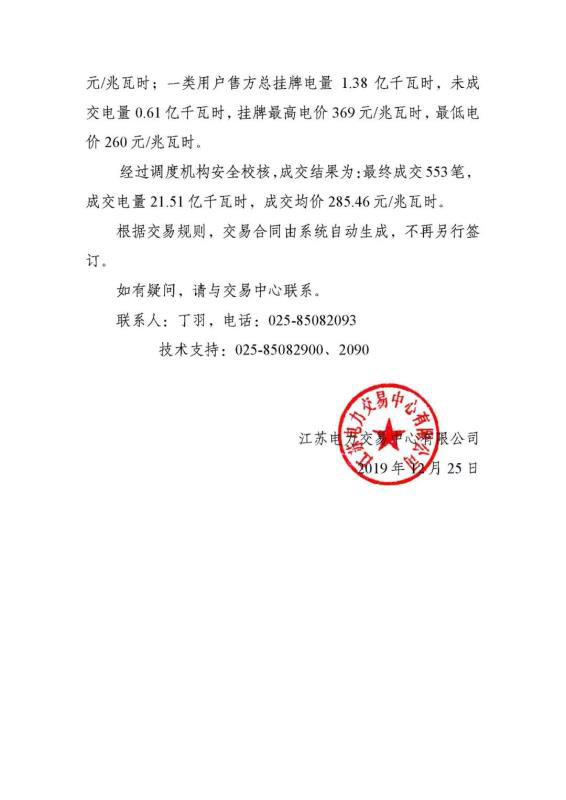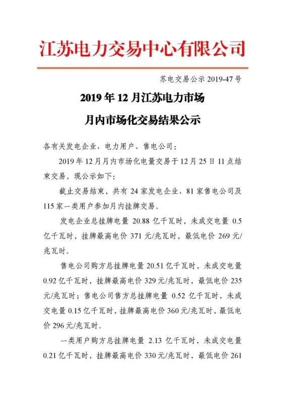 2019年12月江蘇電力市場月內(nèi)市場化交易結(jié)果公示