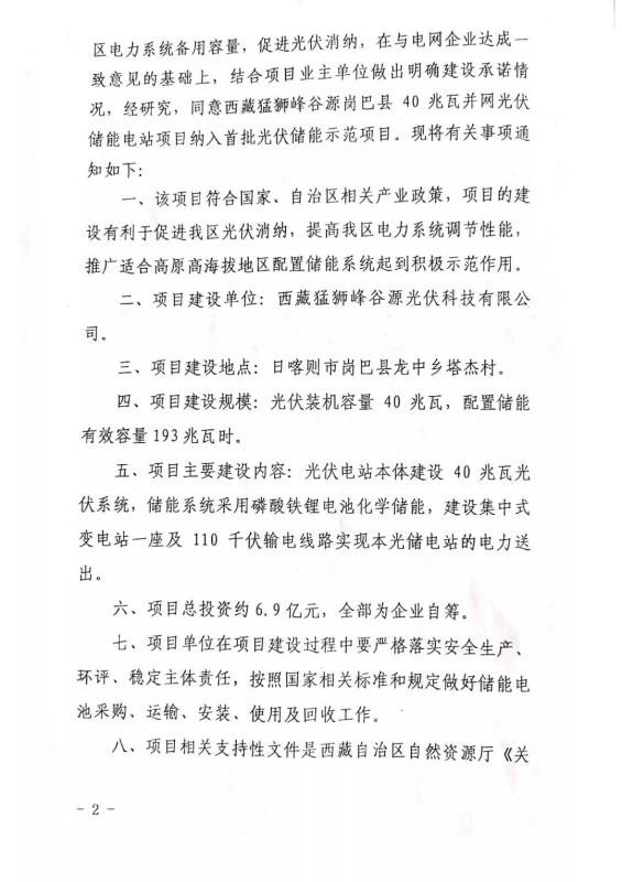 中國(guó)儲(chǔ)能網(wǎng)訊:12月26日,西藏自治區(qū)發(fā)展和改革委員會(huì)下發(fā)《關(guān)于西藏猛獅峰谷源崗巴縣40兆瓦并網(wǎng)光伏儲(chǔ)能電站項(xiàng)目納入首批光伏儲(chǔ)能示范項(xiàng)目的通知》(藏發(fā)改能源〔2019〕877號(hào)),批復(fù)同意西藏猛獅峰谷源崗巴縣40MW光伏+193MWh儲(chǔ)能項(xiàng)目納入西藏首批光儲(chǔ)示范項(xiàng)目。文件肯定了西藏猛獅峰谷源崗巴縣40兆瓦并網(wǎng)光伏儲(chǔ)能電站項(xiàng)目推廣高原高海拔地區(qū)儲(chǔ)能系統(tǒng)的積極示范作用。