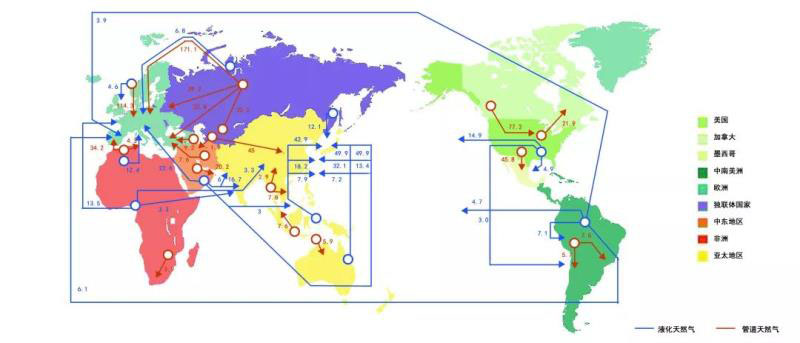 2018年天然氣主要貿(mào)易流向(單位:十億立方米) 來源:BP公司 2019年《世界能源統(tǒng)計(jì)年鑒》