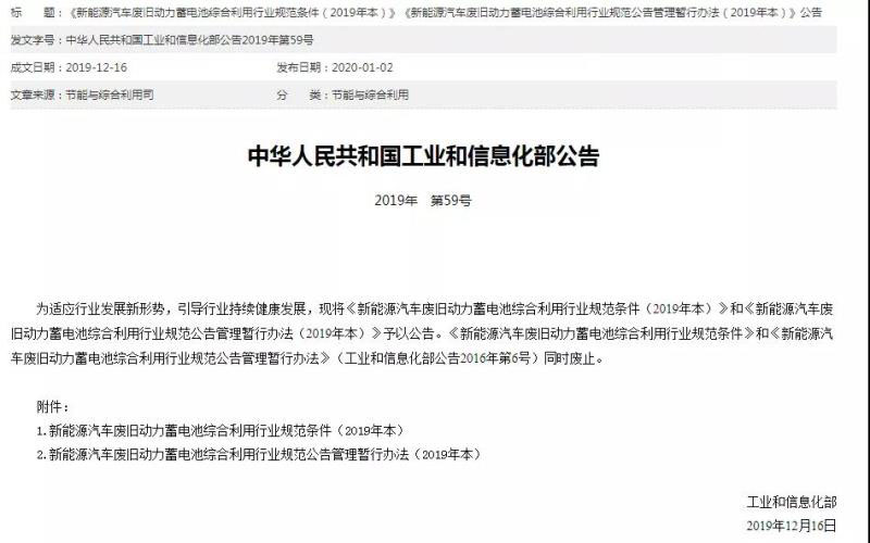 在動力電池大規(guī)模退役潮到來之際,近日,工信部正式發(fā)布了《新能源汽車廢舊動力蓄電池綜合利用行業(yè)規(guī)范條件(2019年本)》(簡稱《規(guī)范條件》)和《新能源汽車廢舊動力蓄電池綜合利用行業(yè)規(guī)范公告管理暫行辦法(2019年本)》,此前在2016年公布的《新能源汽車廢舊動力蓄電池綜合利用行業(yè)規(guī)范條件》和《新能源汽車廢舊動力蓄電池綜合利用行業(yè)規(guī)范公告管理暫行辦法》(工業(yè)和信息化部公告2016年第6號)同時(shí)廢止。