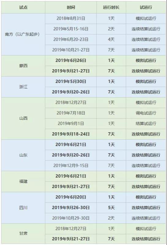 但是,在2018年底的時(shí)間節(jié)點(diǎn)上,僅有南方(以廣東起步)、山西和甘肅3個(gè)試點(diǎn)完成了為期一天的模擬試運(yùn)行。除了南方(以廣東起步)是在當(dāng)年的8月31日完成的模擬試運(yùn)行,山西和甘肅都是在12月27日完成的,而剩余5個(gè)試點(diǎn)完成這一步已經(jīng)至少是半年后的事情了。