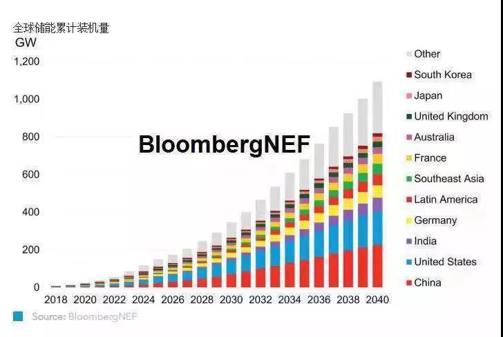 據(jù)彭博新能源財經(jīng)發(fā)布的《2019全球儲能市場長期展望》顯示,全球儲能市場累計裝機規(guī)模將從2018年的9GW/17GWh增長到2040年的1,095GW/2,850GWh,總投資額達到6620億美元。到2040年,中國和美國將是全球最大的儲能市場。