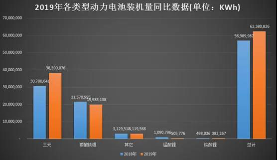從不同電池類型來(lái)看,2019年三元電池裝機(jī)電量約38.39 GWh,占比61.5%;同比增長(zhǎng)25%;磷酸鐵鋰電池裝機(jī)電量約19.98 GWh,占比32%,同比下滑7%;錳酸鋰電池裝機(jī)電量約0.51 GWh,同比下滑54%;鈦酸鋰電池裝機(jī)電量約0.38 GWh,同比下滑23%。