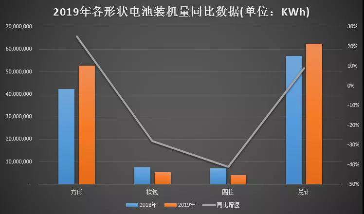 從不同電池形狀來(lái)看,2019年方形、軟包和圓柱的市場(chǎng)占比較2018年進(jìn)一步拉大。
