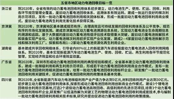 如圖1所示,五大省市均對動力電池回收利用制定目標,其中環(huán)保和技術(shù)方面有一定門檻要求。