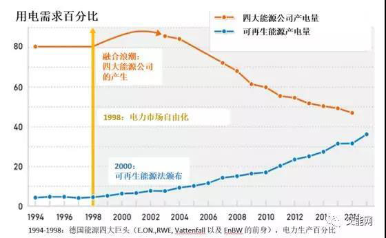 1998是德國電力市場改革的元年,在此之后,雖然供應(yīng)商的種類有所增加,終端用戶擁有了自主選擇權(quán),但本國四大發(fā)電集團(tuán)(RWE,E.ON,Vattenfall和EnBW)仍然占據(jù)著德國發(fā)電量的近50%。2000年通過的《可再生能源法》(EEG)在促進(jìn)可再生能源方面發(fā)揮著核心作用,不僅允許市政公用事業(yè)、中型公司和個(gè)人能源系統(tǒng)進(jìn)入電力市場,讓電力生產(chǎn)進(jìn)一步充分競爭,優(yōu)勝劣汰,也可確保投資安全,使相關(guān)的貸款發(fā)放更為容易。