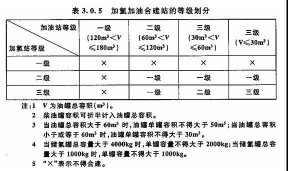 在建站標(biāo)準(zhǔn)方面,目前油氫合建站能夠依據(jù)的僅有2010年制定的《加氫站技術(shù)規(guī)范GB50516-2010》(后有推出《加氫站安全技術(shù)規(guī)范》GB/T34584-2017,但非強(qiáng)制性國家標(biāo)準(zhǔn)),其中3.0.1規(guī)定,加氫站可與天然氣加氣站或加油站聯(lián)合建站(等級劃分如下圖);3.0.9規(guī)定,加氫加油合建站、加氫加氣合建站中的加油、加氣設(shè)施的設(shè)計(jì)、施工,應(yīng)符合現(xiàn)行國家標(biāo)準(zhǔn)《汽車加油加氣站設(shè)計(jì)與施工規(guī)范》GB50156的有關(guān)規(guī)定。
