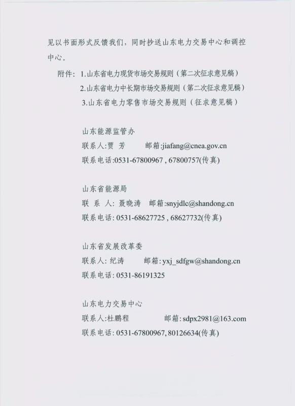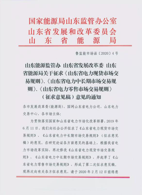 山東為貫徹落實國家和山東電力市場化改革部署,2019年6月11日,山東省向社會公開征求了 《山東省電力現(xiàn)貨市場交易規(guī)則》、《山東省電力中長期市場交易規(guī)則》( 征求意見稿)的意見。在研究論證各方面意見的基礎(chǔ)上,根據(jù)山東省電力市場改革實際,再次修改《山東省電力現(xiàn)貨市場交易規(guī)則》、《山東省電力中長期市場交易規(guī)則》,并起草了《山東省電力零售市場交易規(guī)則》,形成了第二次征求意見稿?,F(xiàn)再次向有關(guān)各方征求意見,并請求社會各界于2020年2月12日前將意見反饋。