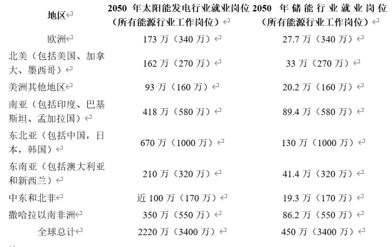 2050年全球主要地區(qū)的太陽能和儲能行業(yè)創(chuàng)造的工作崗位