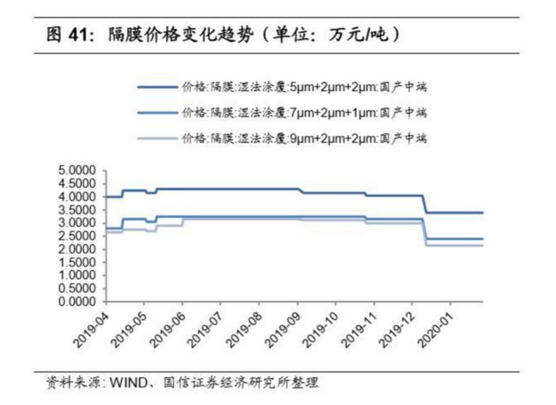 目前國內(nèi)隔膜行業(yè)已進入淡季,出貨普遍不高。隔膜市場混亂,價格戰(zhàn)現(xiàn)象較 為嚴重,待行業(yè)整合結(jié)束,預(yù)計明年隔膜價格可能會回歸理性。本周隔膜價格 穩(wěn)定,其中 5μm 濕法基膜報價 2.5-3.3 元/平方米;5μm+2μm+2μm 濕法涂覆隔 膜報價為 3-3.8 元/平方米;7um 濕法基膜報價為 1.8-2.2 元/平方米; 7μm+2μm+2μm 濕法涂覆隔膜報價為 2.2-2.6 元/平方米。動力價格方面:14μm 干法基膜報價為 1-1.1 元/平方米;9um 濕法基膜報價 1.3-1.7 元/平方米; 9μm+2μm+2μm 濕法涂覆隔膜報價為 1.8-2.5 元/平方米。