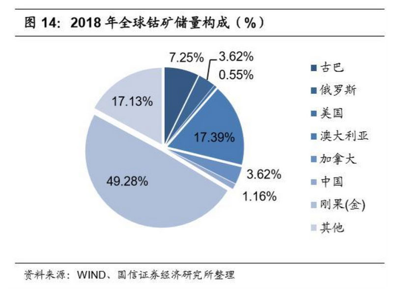 全球鈷礦資源接近 50%來源于剛果(金)。根據(jù)美國地質(zhì)勘探局統(tǒng)計,2018 年 全球鈷礦儲量為 690 萬公噸,其中接近 50%左右來源于剛果金,澳大利亞、古 巴、俄羅斯、加拿大、中國、美國、贊比亞等也均有分布。而從產(chǎn)量角度來看, 2018年全球鈷礦產(chǎn)量為14萬公噸,其中剛果(金)為9萬公噸,占比達到64.29%, 是絕對的鈷資源大國。