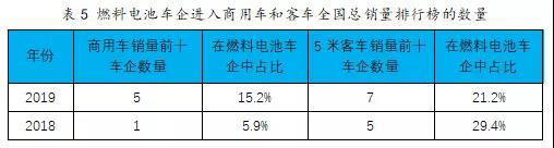 2019年進(jìn)入目錄的燃料電池汽車企業(yè)中,有5家企業(yè)位列商用車2019年全國總銷售榜前十,進(jìn)入5米以上客車2019年全國總銷售榜前十的車企也有7家,相比2018年已有明顯提升,主要商用車(含客車)車企對燃料電池汽車行業(yè)重視度普遍提升。但占全部上榜燃料電池車企數(shù)量的比例分別為15.2%和21.2%,多數(shù)燃料電池車企在傳統(tǒng)汽車行業(yè)實(shí)力不強(qiáng)。