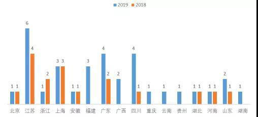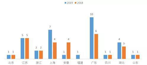 從企業(yè)區(qū)域分布來看,2019年變化不大,在產(chǎn)業(yè)發(fā)展較早、科研力量較強(qiáng)的地區(qū)聚集效應(yīng)更為明顯。僅廣東、上海、江蘇、湖北四地上榜企業(yè)數(shù)量占比已達(dá)72%。安徽地區(qū)企業(yè)變化較大,4家上榜企業(yè)僅剩1家。