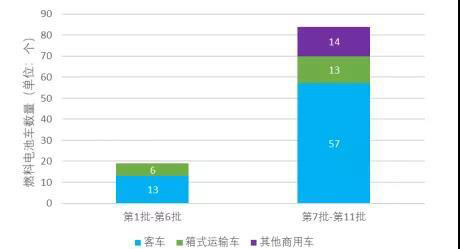 去年下半年數(shù)量大增。2019年上半年列入目錄的燃料電池車數(shù)量較少,第1批-第6批合計(jì)推出19款,而從下半年來看,第7批-第11批燃料電池車數(shù)量大幅增長342%,達(dá)84款,接近2018年全年數(shù)量。