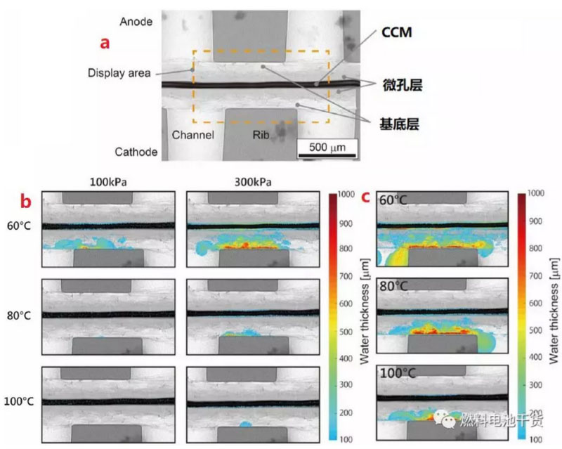 下圖a顯示了開路狀態(tài)下MEA的原始成像,為聚焦GDL中的液態(tài)水分布,圖像經(jīng)裁剪僅顯示黃色虛線區(qū)域。下圖b展示了1.5 A/cm2下MEA中液態(tài)水分布情況。在較高電池溫度下,由于水蒸氣的飽和度隨溫度呈指數(shù)增長,液態(tài)水團(tuán)聚現(xiàn)象減弱。對應(yīng)100 kPa時(shí),在100°C高溫下沒有液態(tài)水,表明在此溫度下氧氣濃度太低,濃差過電勢增加。相反,當(dāng)氣體加壓時(shí),液態(tài)水的團(tuán)聚現(xiàn)象加重,這歸因于氣體加壓后電池性能提高,抑制“廢熱”生成和釋放,從而抑制了溫度升高。在該電流密度下,因?yàn)榧贡呈荕EA中最冷的部分,水在脊背凝結(jié)。盡管在氣體加壓下GDL中的液態(tài)水量增加了,但當(dāng)壓力升高時(shí),濃差過電勢降低,表明脊背上的液態(tài)水并不會(huì)影響濃差過電勢。