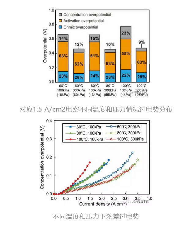 下圖為1.5 A/cm2電密下活化、濃差和歐姆三大過電勢的細(xì)分情況。在所有情況下,活化過電勢占據(jù)總過電勢的一半以上,歐姆過電勢約占總過電勢的25%。溫度100°C和壓力100 kPa下的濃差過電勢高于其他任何工況。該工況下氧氣的摩爾分?jǐn)?shù)僅為約4%(因?yàn)樗魵庹歼M(jìn)氣80%)。進(jìn)氣加壓使過電勢均下降,活化過電勢顯示出特別明顯的降低。這是因?yàn)闅怏w加壓時(shí)氫氣和氧氣的分壓也增加。氣體加壓導(dǎo)致濃差過電勢降低,而歐姆過電勢則相對增加。高電密下,歐姆過電勢會(huì)對電池性能產(chǎn)生重大影響。因此,對于高電密操作和運(yùn)行,降低歐姆過電勢尤為重要。
