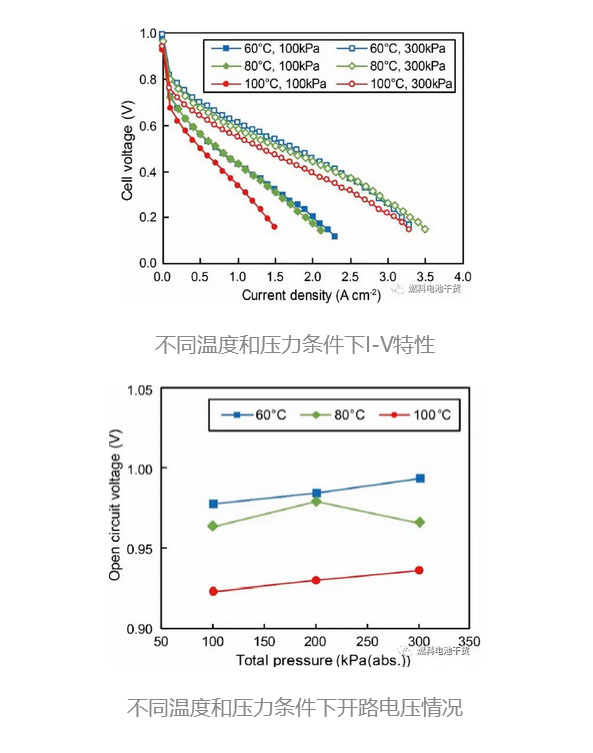 然而,高溫運(yùn)行易引起質(zhì)子交換膜干燥。為保證高質(zhì)子傳導(dǎo)率,質(zhì)子膜需要保持一定程度的濕潤。當(dāng)燃料電池工作在高濕情況下,若溫度上升,水蒸氣分壓呈現(xiàn)指數(shù)上升,氧氣分壓就會(huì)降低,性能降低較為明顯。如下圖所示,電池工作溫度100℃和120℃對應(yīng)性能低于電池工作溫度80℃。因此,為獲取高輸出性能,需對進(jìn)氣升壓以增加氧氣分壓氣體。目前,高壓條件下高溫操作對燃料電池的性能影響已有研究,尚未有高溫條件下高壓操作對燃料電池性能的影響研究。