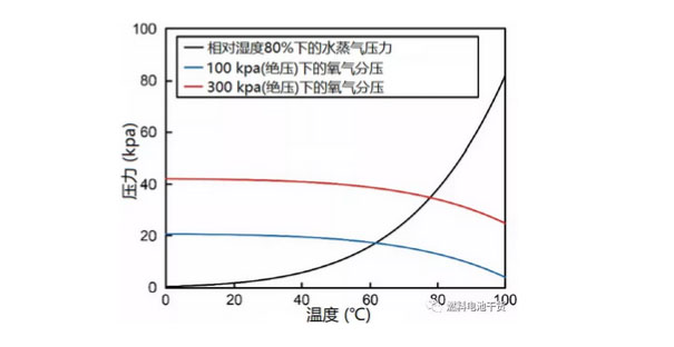 相對濕度80%下的水蒸氣壓力和100、300 kpa壓力下氧氣分壓隨溫度變化關(guān)系