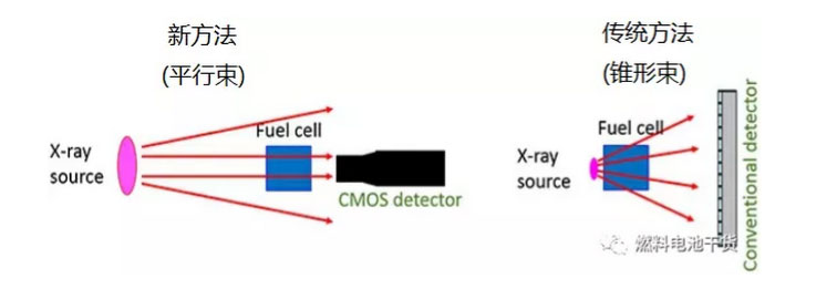 水熱管理課題一直是燃料電池科學(xué)和工程研究的熱門課題。此前,燃料電池評斷只能依靠宏觀可視化技術(shù)或依據(jù)輸出性能變化間接推斷電池內(nèi)部具體物理化學(xué)細(xì)節(jié),尚沒有一種設(shè)備可以長時(shí)間以高分辨率顯示運(yùn)行中的燃料電池內(nèi)部產(chǎn)生的水。在NEDO項(xiàng)目資助下,由燃料電池前沿研究中心技術(shù)研究協(xié)會(huì)和東京工業(yè)大學(xué)Shuichiro Hirai教授課題組聯(lián)合組成的項(xiàng)目組成功將平行X射線束和CMOS傳感器技術(shù)相結(jié)合,在全球范圍內(nèi)首次開發(fā)了一種可視化技術(shù),實(shí)現(xiàn)以微米級高分辨率實(shí)時(shí)觀察燃料電池內(nèi)各層及其界面產(chǎn)水行為。
