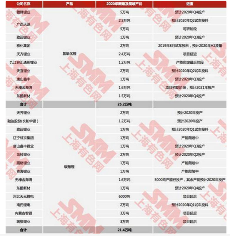 據(jù)SMM統(tǒng)計(jì),2019年中國(guó)碳酸鋰產(chǎn)量為15.9萬噸,中國(guó)氫氧化鋰產(chǎn)量為7.6萬噸。隨著年初國(guó)內(nèi)新能源汽車市場(chǎng)釋放相關(guān)利好政策,以及特斯拉國(guó)產(chǎn)化進(jìn)程的加快,2020年國(guó)內(nèi)上游鋰鹽廠新建產(chǎn)能數(shù)量以及進(jìn)度情況,尤其是國(guó)內(nèi)氫氧化鋰產(chǎn)能的建設(shè)情況受到全行業(yè)關(guān)注。對(duì)此我們總結(jié)如下: