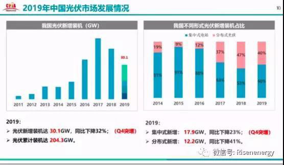 據(jù)統(tǒng)計(jì),2019年光伏新增裝機(jī)30.1GW,同比下降32%,光伏累計(jì)裝機(jī)達(dá)到203.3GW。其中,集中式光伏新增裝機(jī)17.9GW,分布式光伏新增裝機(jī)12.2GW。
