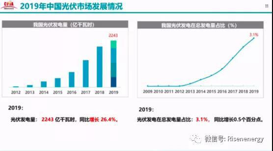 此外,2019年光伏發(fā)電量2243億千瓦時(shí),同比增長26.4%,占總發(fā)電量3.1%,同比增長0.5個(gè)百分點(diǎn)。