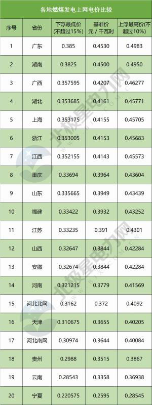 此外,國家發(fā)改委指導意見明確表示,改革后,煤電電價的基準價按當地現行燃煤發(fā)電標桿上網電價確定,浮動幅度范圍為上浮不超過10%、下浮原則上不超過15%,2020年暫不上浮。多地也延續(xù)了這一說法。
