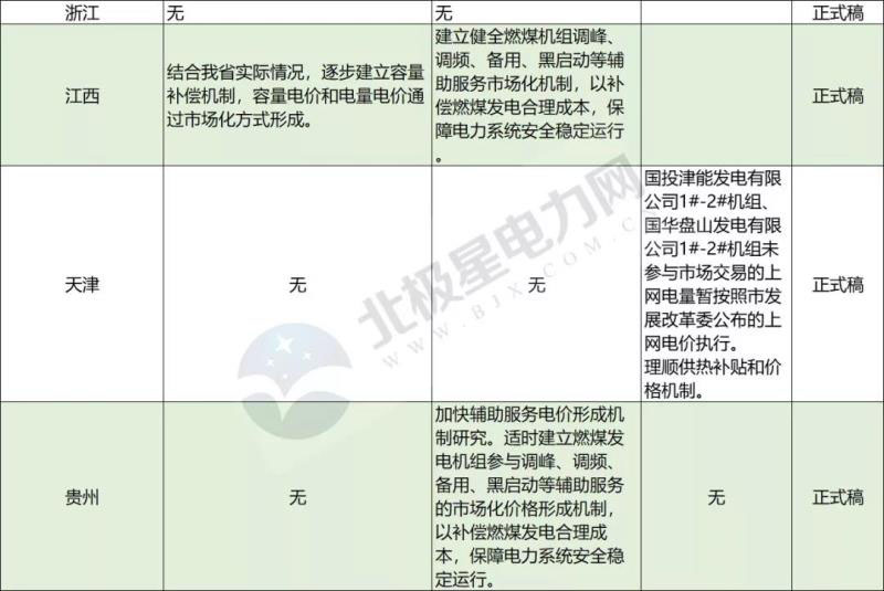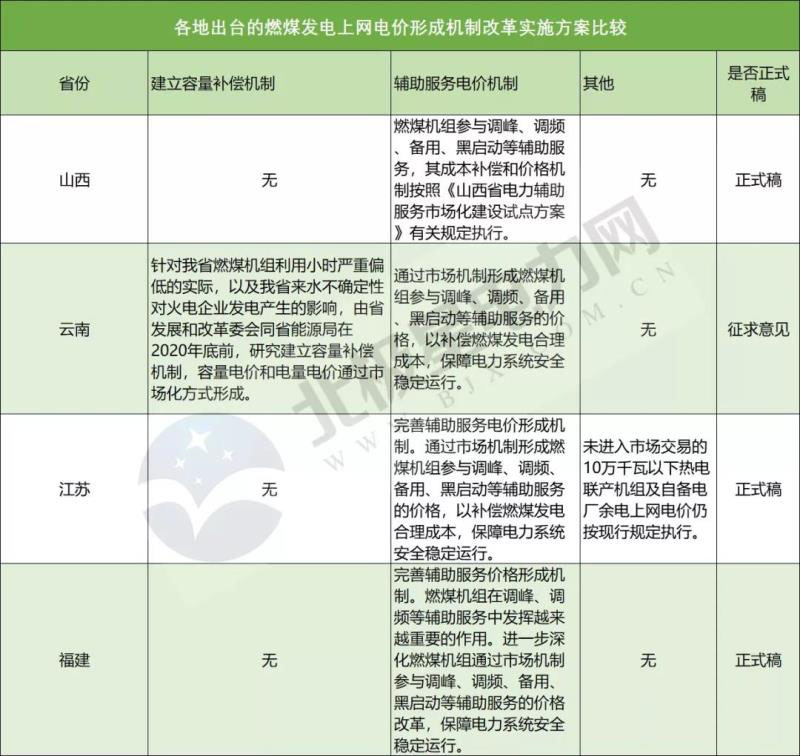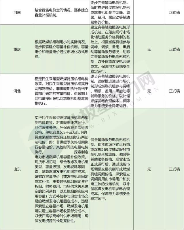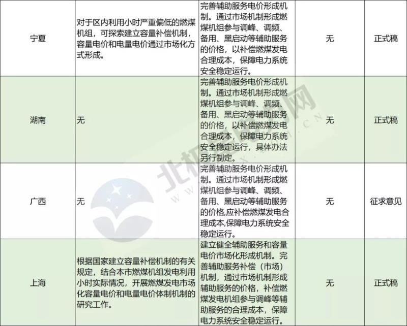 根據國家發(fā)改委文件要求,各地需發(fā)文細化煤電電價形成機制方案。截至目前,北極星電力網根據公開信息,不完全統計了19個地區(qū)的煤電電價形成機制改革實施方案。各地方案與國家發(fā)改委指導意見大方向相同,但是,在細節(jié)實施上,特別是涉及到“輔助服務電價”、“容量補償機制”等部分內容,還是有較大的差別。