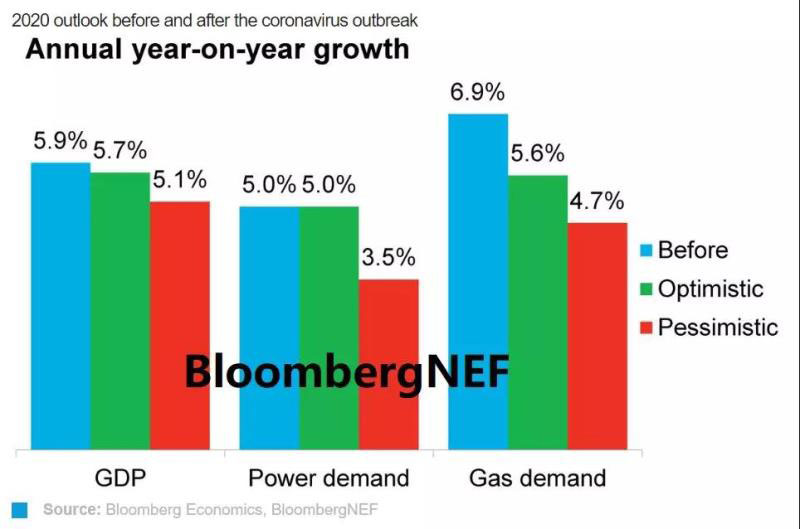 在疫情爆發(fā)前,中電聯(lián)預(yù)測(cè)2020年全社會(huì)用電量將增長(zhǎng)4%-5%,與2019年全社會(huì)用電量增長(zhǎng)4.5%相近。在BNEF的樂觀情景中,中電聯(lián)的預(yù)測(cè)仍可能成為現(xiàn)實(shí);在悲觀情景中,全社會(huì)用電量增長(zhǎng)可能降至3.5%。
