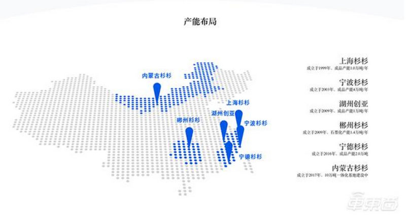 到目前為止,杉杉股份共擁有上海杉杉、寧波杉杉、湖州創(chuàng)亞、郴州杉杉、寧德杉杉、內(nèi)蒙古杉杉六大負極材料生產(chǎn)基地,產(chǎn)能達到8萬噸/年,在EVTank的統(tǒng)計中排名全球第三。