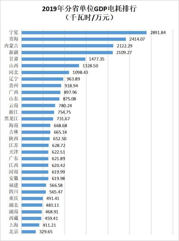 2019年,我國單位GDP電耗為729.21千瓦時/萬元。各省每萬元單位GDP的電力消耗情況又如何呢?請看下圖排行。