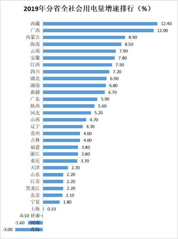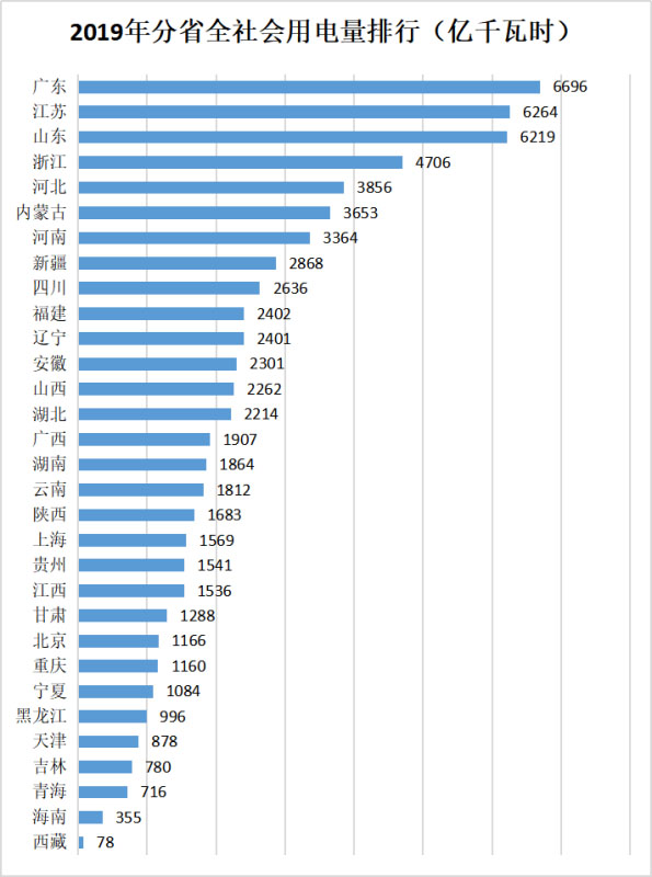 2019年全國分省全社會用電量及增速排行如上兩圖所示:從用電量看,廣東(6696億千瓦時)第一,西藏(78億千瓦時)墊底;從用電量增速看,西藏以12.4%的增速排第一,青海(-3.0%)墊底。